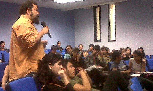 Pasó luego a explicar la ciberresistencia, y dijo que se da en dos vertientes: online (haciendo uso de las tecnologías de la información, con característica de ser software libre),y la offline, que se da en las plazas y calles con diversas actividadez como protestas y otras manifestaciones, así como labor comunitaria.