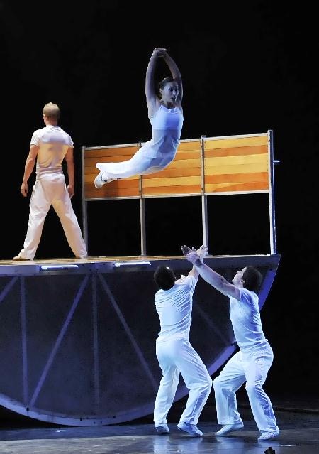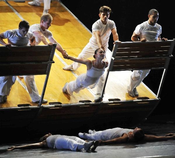 Sin palabras, tan sólo con el lenguaje corporal que incluyó desde pasos de ballet clásico, hasta danza contemporánea, gimnasia olímpica y acrobacia, los artistas desarrollaron la historia contada por cada cuadro: un agotador entrenamiento militar, el amoroso cortejo de una pareja, la disputa por el pequeño espacio de una banca, el hombre frente a la máquina y, por último la fragilidad humana ante las fuerzas de la Naturaleza representada por un mar encrespado pero invisible. Simbolismo puro.