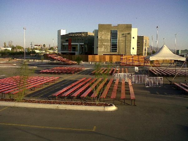 El escenario que está siendo colocado en la explanada del Centro Cultural Paso del Norte, fue girado 180 grados para quedar de vista al poniente.
