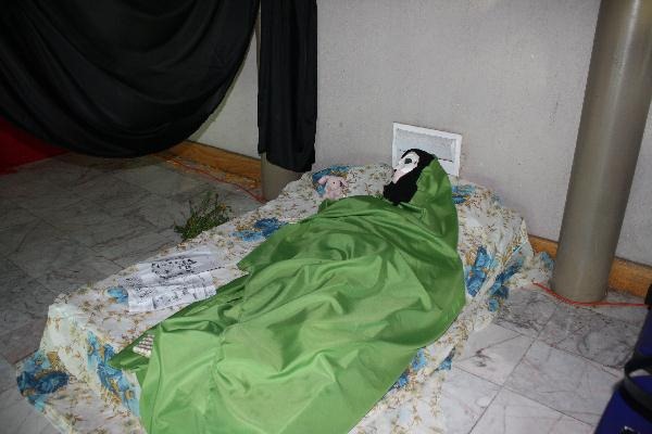 A la derecha del altar principal fue instalado el dedicado a la mujer que es el personaje principal de la novela Aura, y que descansa sobre una cama para recuperar su belleza. “Voy a mi juventud, mi juventud viene a mi”. (Texto y fotos: UACJ)