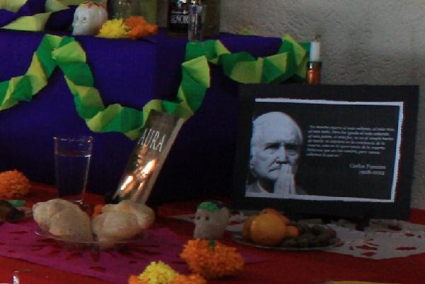 Flores de cempasúchil, un platillo de mole poblano, arroz, dulce elaborado con camote y guayaba, calaveras de dulce, pan de muerto, una botella del licor “Reserva del Señor”, el infaltable papel picado, dos ejemplares de la novela “Aura”, y fotografías del escritor, forman parte del altar dedicado a Carlos Fuentes, el escritor mexicano fallecido en mayo de 2012 y que es uno de los autores más reconocidos.