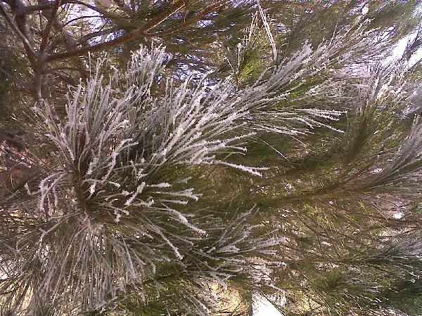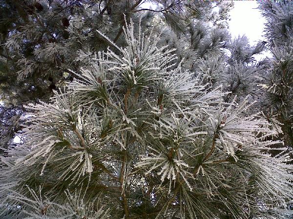 La escarcha -en forma de pequeñas lanzas blancas- se formó por igual en arbustos y árboles de hoja perenne, que en aquellos que ya había perdido su verde ropaje y sólo mostraban sus ramas desnudas.