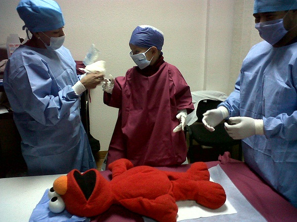 En esta última etapa, cada niño fue provisto de los implementos requeridos por el cirujano: bata, mascarilla, guantes, vendas (excepto bisturí), para proceder a «realizar» la operación en el paciente-muñeco (en este caso, Elmo), bajo la supervisión de estudiantes de Medicina.