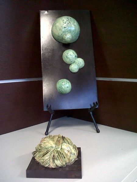 Si bien todas las piezas son de una gran exquisitez, resalta de manera particular las esculturas realizadas en barro y cocidas en horno para obtener el acabado de cerámica. Varias son formas redondas con multitud de hojas o pétalos (según se mire).