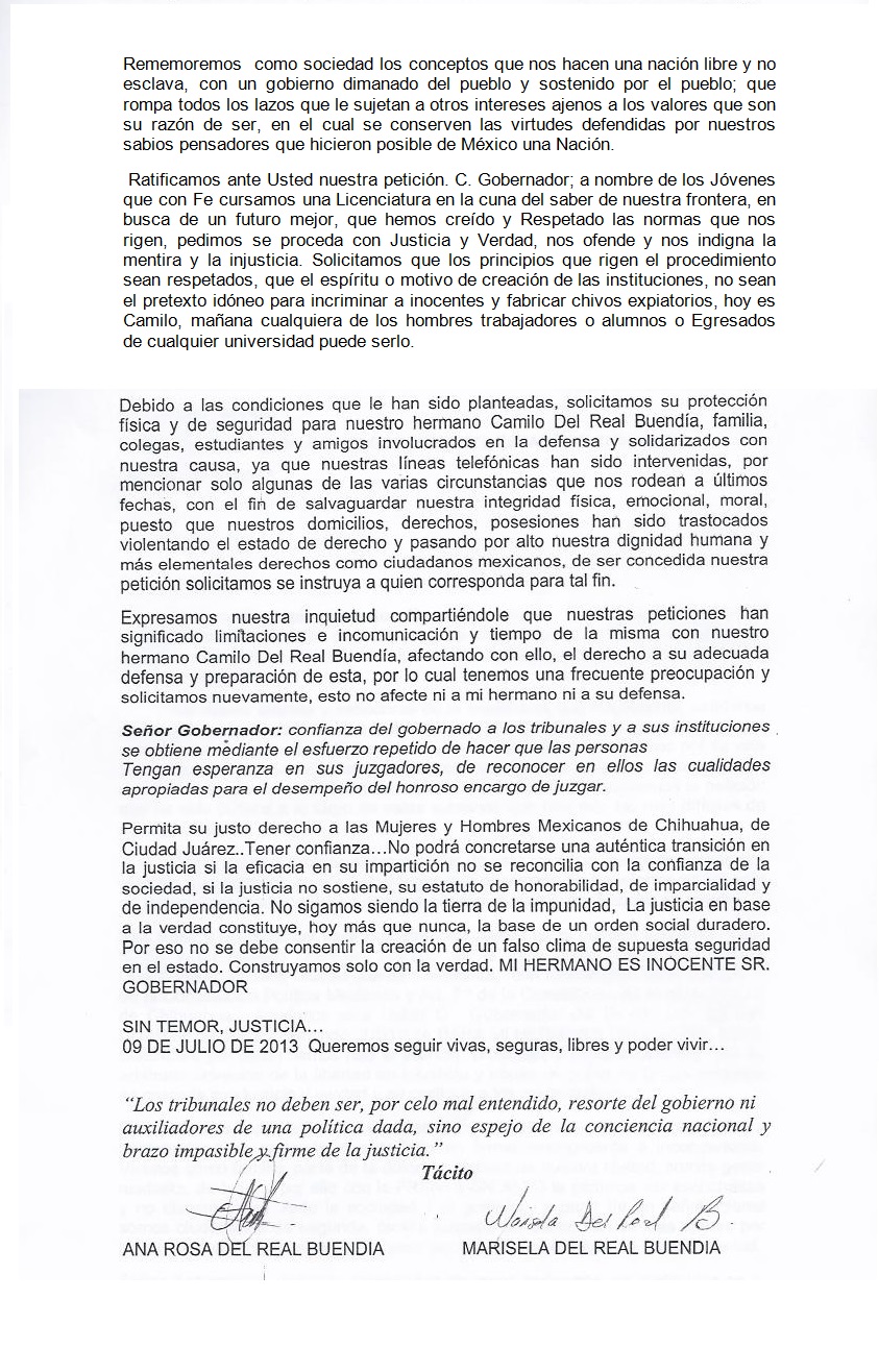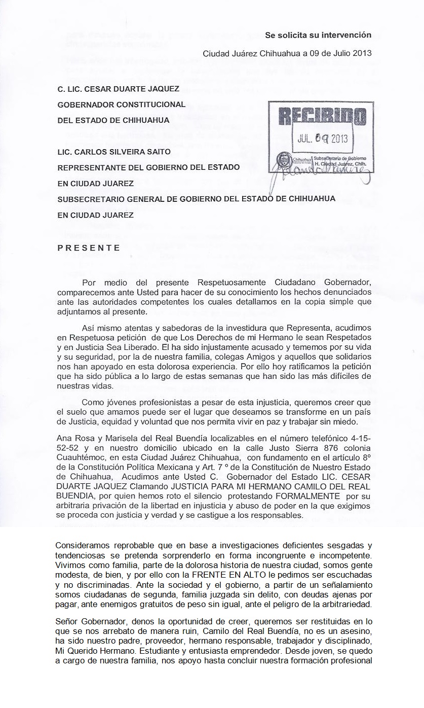 Los allegados a Camilo infieren que el hecho de que una de las jóvenes azesinadas en Ciudad Juárez -Idaly Juache Laguna- prestara sus servicios en 2010 como modelo para anuncios de TV en la empresa e publicidad de los hermanos Del Real, ha sido utuilizado por las autoridades de la Fiscalía para involucrarlo injustamente.