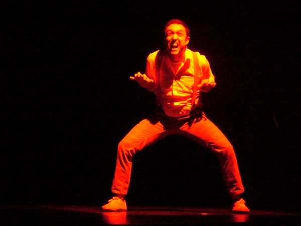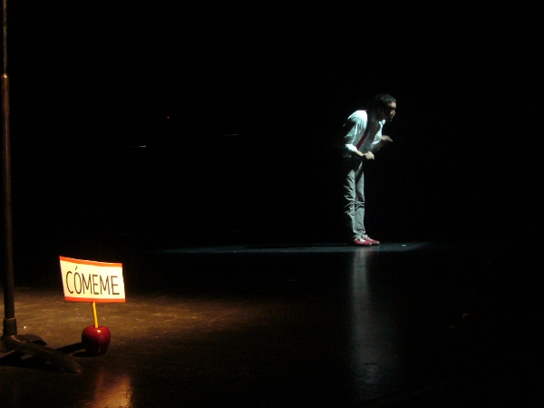 Un solo actor -Fabián Garza- interpreta a todos los personajes en un escenario provisto sólo de un atril, la manzana y un juego de luces, en una muy sólida actuación con amplios recursos de mímica, lenguaje corporal y facia,l y asimismo canto y danza.