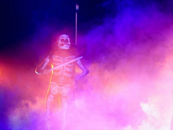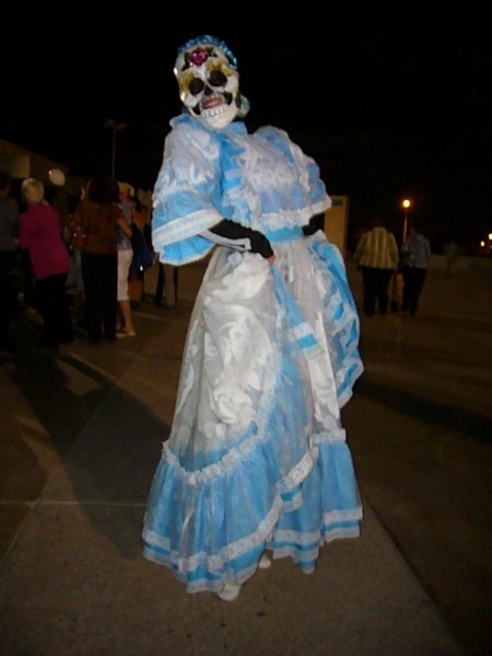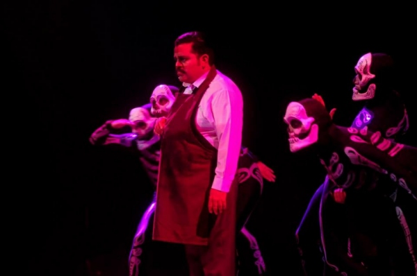 Sobre el escenario, una treintea de bailarines interpretaron a los más variados personajes, algunos portando máscaras de calavera (otra vez La Catrina, que cantó y bailó), así como un hombre caracterizando al maestro grabador.