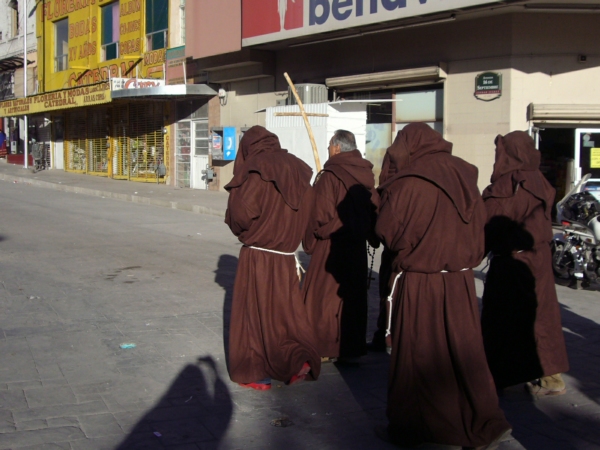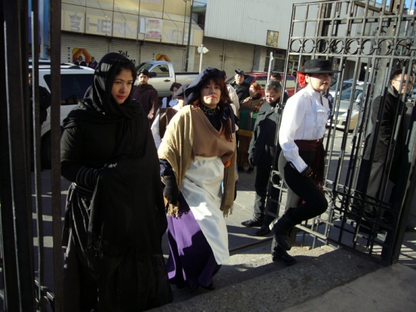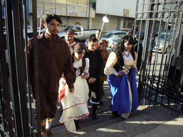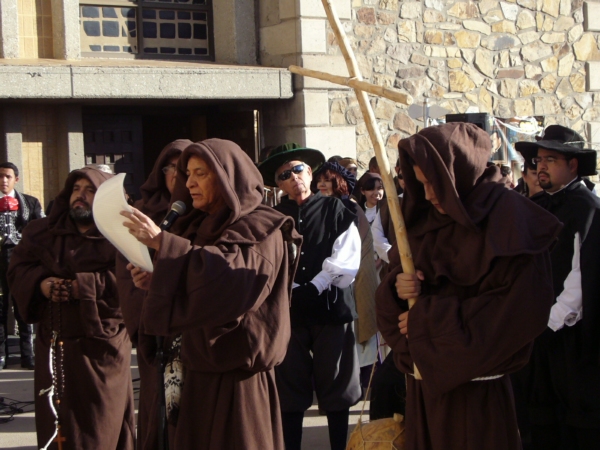 Luego de dar la vuelta a la Catedral, la columna humana con una cruz al frente, subió la escalinata rumbo al atrio, donde el personaje de Fray García dio lectura al acta de fundación de la Misión de Guadalupe.