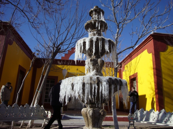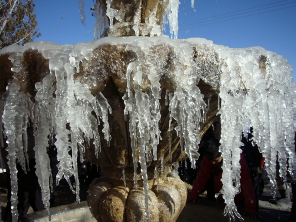 La fuente del Museo, coronada de hielo invernal, dio al evento un toque aún más festivo a esta actividad del Rey Mago Bombero.