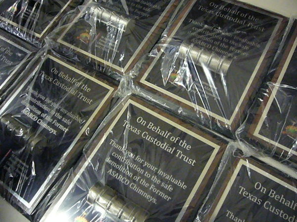 Las placas tienen inscrita una leyenda en inglés de agradecimiento por parte del Estado de Texas. La Smelting and Refining Company (Asarco) que una fundidora de cobre y otros metales que contaminó por décadas el aire, suelo y posiblemente hasta los mantos freáticos en la frontera. Fundada en 1881, se encontraba cerrada desde 2009, aunque sus nuevos propietarios -Grupo México- intentaron por años su reapertura ante el gobierno de Texas.