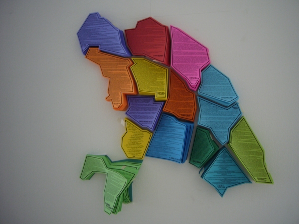 Hay más: una obra tipo instalación, invita a llevarse algo de Juárez: es un rompecabezas con la forma del plano de la ciudad, con hojas multicolores y desprendibles, con narrativas urbanas originales.
