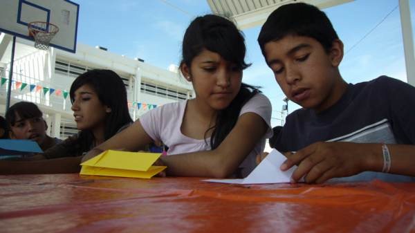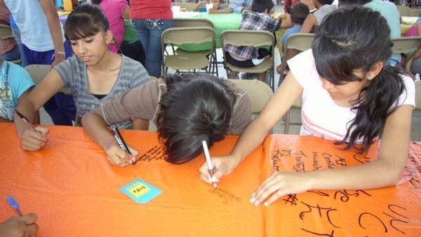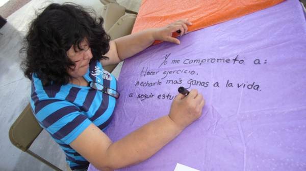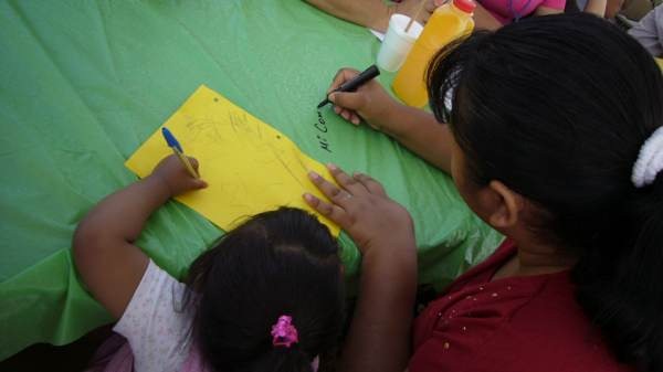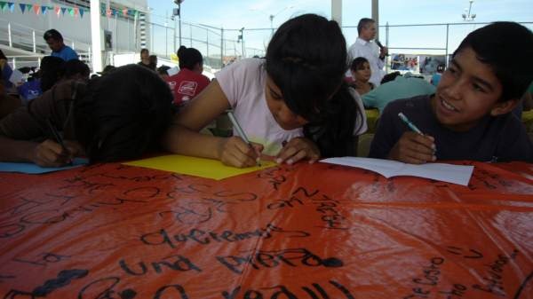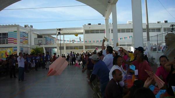 Las siguientes dinámicas grupales consistieron en que cada quien plasmara en palabras sus sueños en una hoja de papel y con ella elaborar un avioncito para ser echado a volar por la mano de un chiquillo o chiquilla, y asimismo escribir en los manteles de plástico con plumón o bolígrafo, un compromiso personal por una mejor convivencia en familia o con los vecinos.