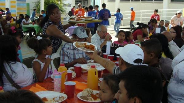 La cancha de basquetbol del Centro Comunitario Francisco I. Madero -ubicado en la colonia del mismo nombre- fue el lugar donde quedó instalada la gran mesa comunitaria, para recibir a los comensales. Familias completas se hicieron presentes para participar en este gran desayuno.
