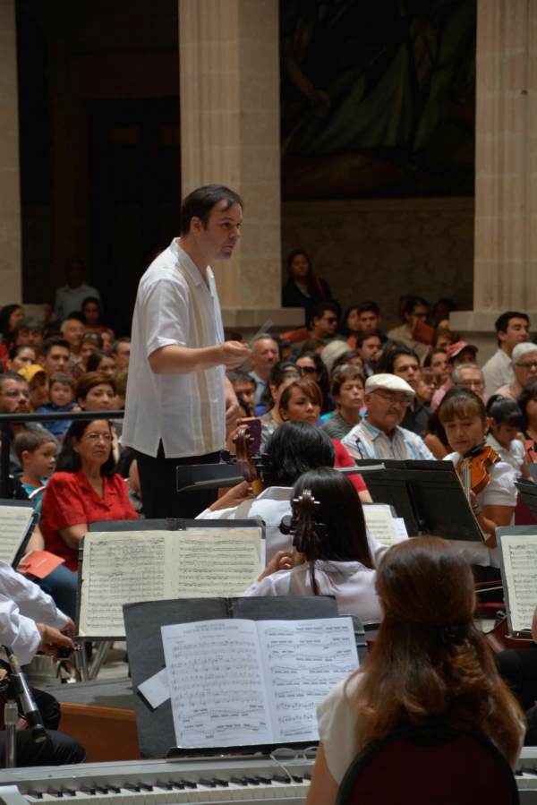 CHIHUAHUA.- Un domingo de película disfrutaron las familias chihuahuenses que asistieron al Palacio de Gobierno para escuchar el concierto “Clásicos del Cine” que ofreció la Orquesta Filarmónica del Estado, la cual interpretó los temas musicales de películas super taquilleras como lo fueron Harry Potter, la Guerra de las Galaxias, Psicosis, La Misión y Cinema Paradiso. Iniciando con un tema clásico de las películas de vaqueros, como lo es la Obertura de “Guillermo Tell” (de Giacommo Rossini) que se relaciona con el emblemático Llanero Solitario, el patio del Palacio de Gobierno se llenó a su máxima capacidad con el público asistente y con los acordes musicales.