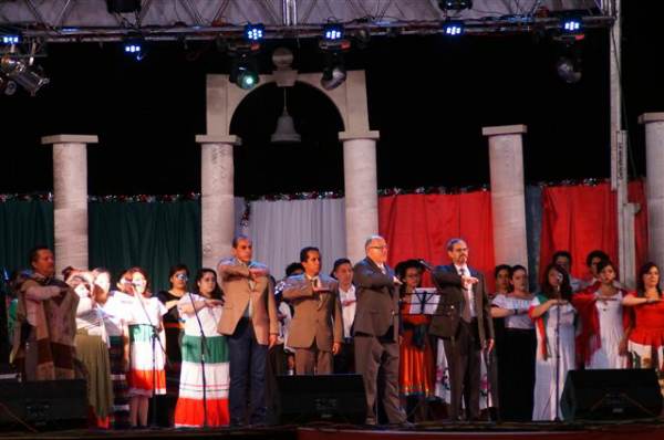 Caída la noche, la fiesta seguía y fue en punto de las 11 de la noche cuando, ante una ligera lluvia, el rector de la UACJ, Ricardo Duarte Jáquez, subió al templete para encabezar la tradicional ceremonia del grito.