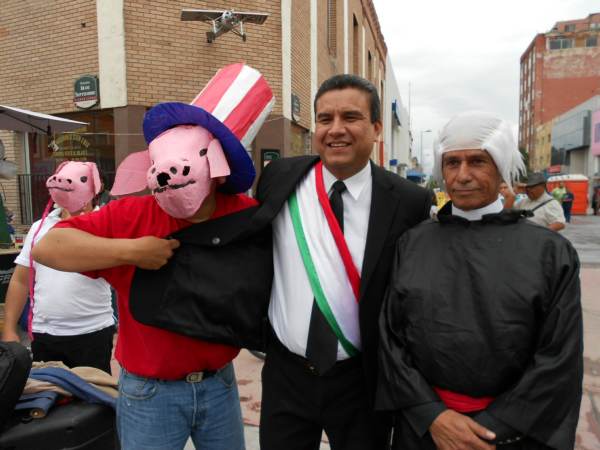 En la escenificación realizada al aire libre, los personajes actuados por activistas fueron el presidente Enrique Peña Nieto, los partidos mayoritarios representados en el Congreso de la Unión (PRI, PAN y PRD, caracterizados con cabezas de marranos), el Tío Sam, Don Miguel Hidalgo y Costilla, y Pito Pérez haciendo las veces de narrador (con todo y su caguama).