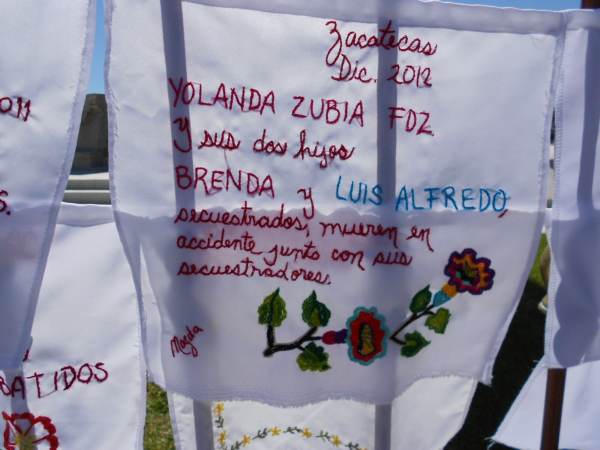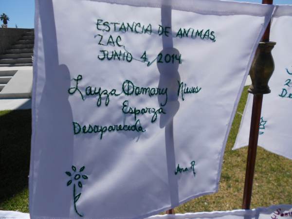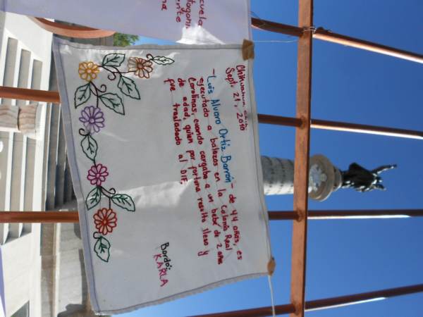Seguidamente, llegó un grupo de madres de mujeres asesinadas y desaparecidas, para colocar mantas que formaban la palabra «Búsquenla», además de instalar dos mantas con galerías de los casos que incluyen diez del año en curso.