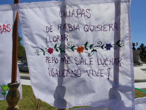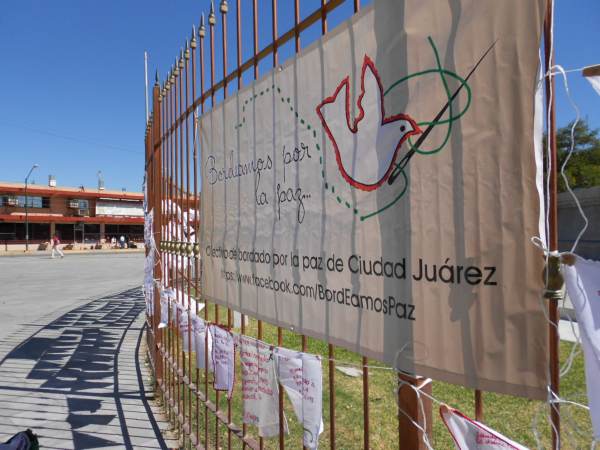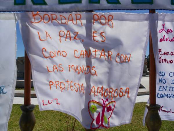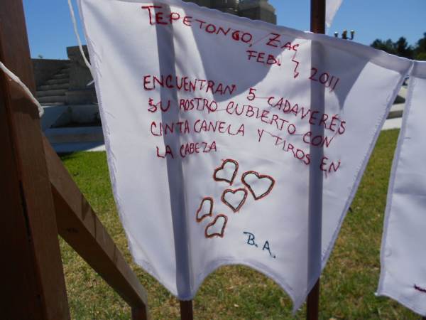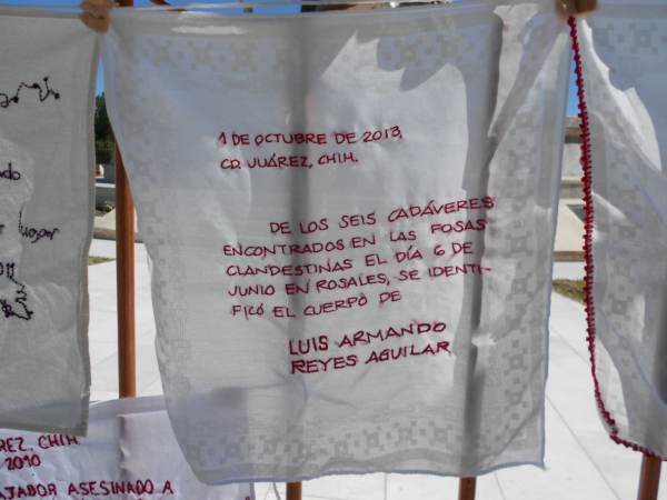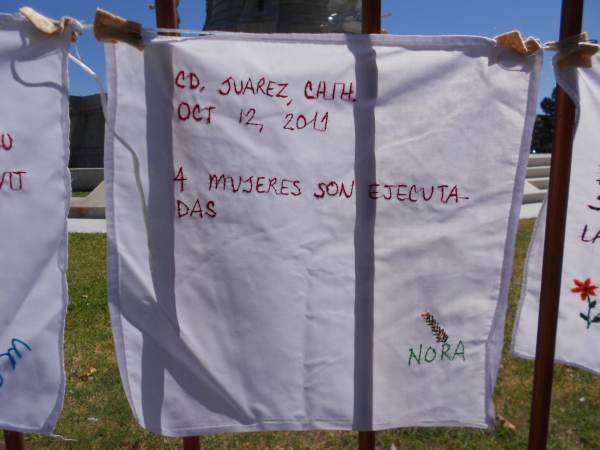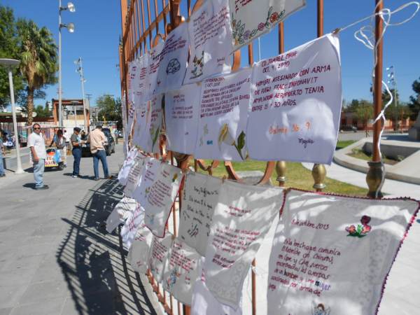 Primeramente, un grupo de activistas que borda pañuelos con los casos de asesinatos, montó en la reja perimetral una galería de los trabajos que han realizado durante meses.
