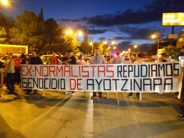 El contingente portaba varias mantas de repudio a los hechos acaecidos en Iguala (Guerrero) y de solidaridad con Ayotzinapa, así como hojas con los rostros y nombres impresos de los estudiantes normalistas.