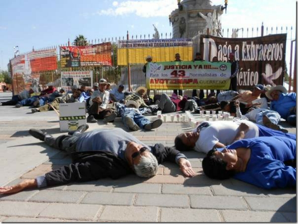 El tema de la justicia lleva a otra lucha actual: el Movimiento Global por Ayotzinapa. Recientemente, los braceros realizaron el performance de tirarse al piso y permanecer quietos, como muertos, esto en apoyo a los 43 normalistas y la exigencia de castigo a los responsables de la atrocidad.