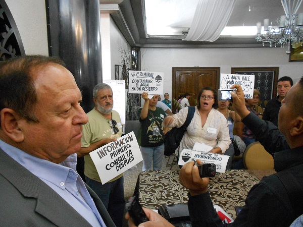 Una treintena de activistas irrumpieron en la «Consulta pública para la modificación del programa de manejo del ANPFF Médanos de Samalayuca», para protestar contra la apertura de una mina por parte de una compañía canadiense por considerar que vendrá a generar una grave problemática de contaminación al medio ambiente, empezando por el agua.