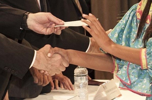 Marisela Chávez, joven rarámuri, estudiante de secundaria, agradeció al Municipio a nombre de los beneficiarios.
