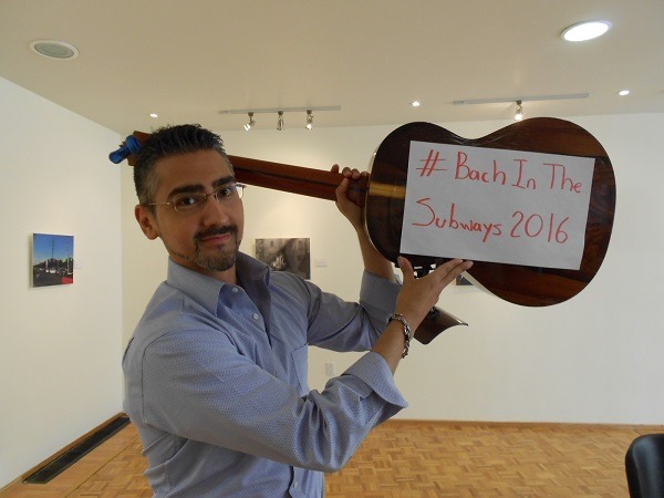 El hashtag #BachInTheSubways2016 fue mostrado en una hoja de papel adhesiva en la parte posterior de una de las guitarras.