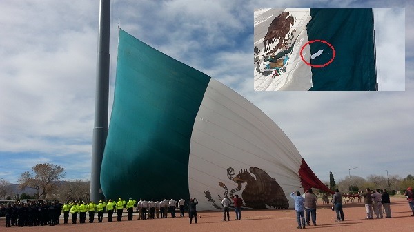 En esta ocasión, el daño ocurrió en los momentos mismos en que personal de la Secretaría de la Defensa Nacional llevaba a cabo el izamiento en la Plaza de la Mega Bandera. En la secuencia fotográfica parece que el lábaro está intacto en los primeros instantes del ascenso; además de que sería impensable que procedimiento continuara en caso de que el desperfecto hubiese sido detectado antes, y el tirón del mecanismo de poleas fue el factor determinante en el incidente.
