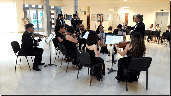 Fueron 11 artistas -seis mujeres y cinco hombres- quienes interpretaron un programa musical denominado Cuerdas clásicas y más, integrado por cuatro piezas de grandes compositores, con el Mtro. Guillermo Quezada Novela en la batuta.