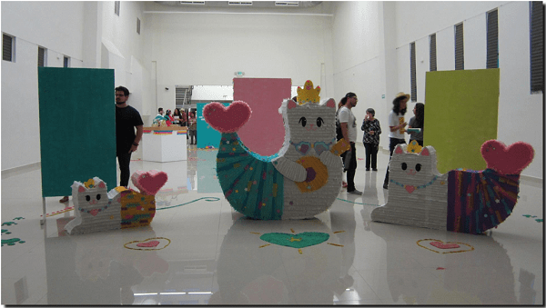Las obras son pinturas, esculturas y objeto-arte, con tres piñatas que dominan la exposición. De manera complementaria, en el vestíbulo fue instalada una mesa manualidades con el mismo tema (hay una Lotería Mishi-cana), todo a la venta.