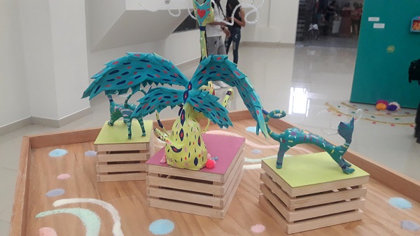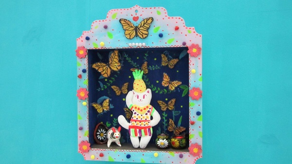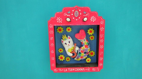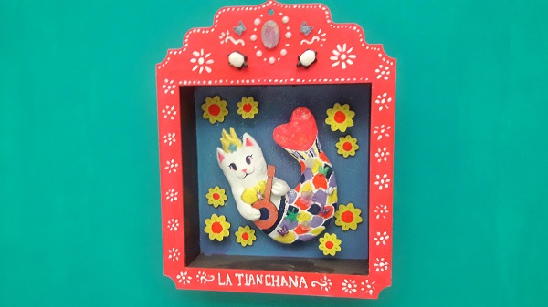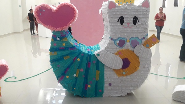 Las obras son pinturas, esculturas y objeto-arte, con tres piñatas que dominan la exposición. De manera complementaria, en el vestíbulo fue instalada una mesa manualidades con el mismo tema (hay una Lotería Mishi-cana), todo a la venta.