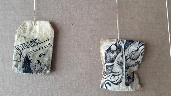 Destacan los minuciosos en tinta china en bolsitas de té, en varias de las obras.