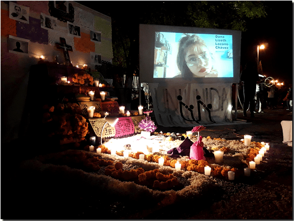 El altar de muertos instalado por miembros del citado colectivo fue en memoria de Dana Lizeth y otros universitarios y universitarias que han sido víctimas mortales de la violencia.