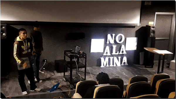La instalación consistió en el eslogan «NO A LA MINA» y un par de pequeñas pantallas, en las cuales fueron proyectados diversos aspectos del polémico proyecto denominado «La Gloria», entre los cuales había imágenes de las protestas de activistas.