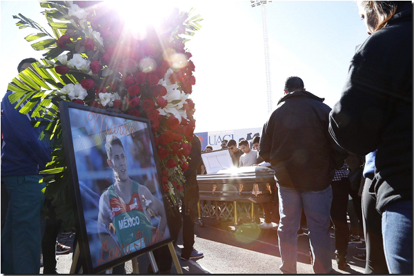 En la pista del Estadio Olímpico Benito Juárez, lugar que fue testigo de los entrenamientos exhaustivos que realizaba para su preparación atlética, este lunes fue rendido un homenaje de cuerpo presente a Martín Alejandro Loera Trujillo, asesinado la semana pasada en el estacionamiento de una plaza comercial.