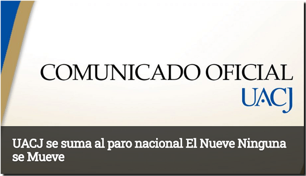 Sensible ante los índices de violencia contra las mujeres y con el compromiso de construir una agenda que permita nuevos esquemas de convivencia y respeto, la Universidad Autónoma de Ciudad Juárez se une paro nacional del lunes 9 de marzo, para facilitar que todas las mujeres que integran la comunidad universitaria puedan atender la convocatoria que busca erradicar la violencia de género que tanto afecta a nuestra ciudad. | #ElNueveNingunaSeMueve #UnDíaSinMujeres