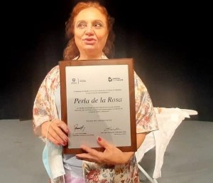 Al término de la función, Perla de la Rosa recibió un reconocimiento de manos del director de Desarrollo Cultural de la Secretaría de Cultura, Daniel Miranda Cano, la cual honra cuatro décadas ininterrumpidas de trabajo escénico.