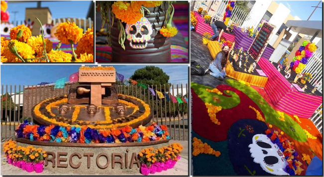 La exposición fue instalada durante el fin de semana, con todos los elementos tradicionales como papel picado, cempasúchil, aserrín, etc., y ofrendas como el pan de muerto en versión de cartulina.