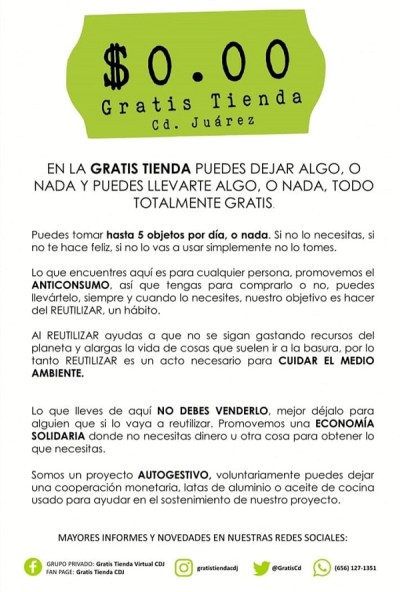 Lo que lleves de aquí NO DEBES VENDERLO, mejor déjalo para alguien que sí lo vaya a reutilizar. Promovemos una ECONOMÍA SOLIDARIA donde no necesitas dinero u otra cosa para obtener lo que necesitas,.