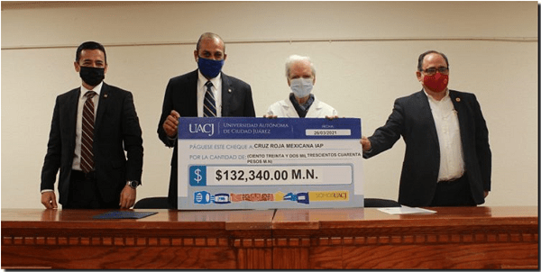 Con aportaciones voluntarias de su comunidad estudiantil, la Universidad Autónoma de Ciudad Juárez hizo un donativo por 132 mil 340 pesos a la Cruz Roja Mexicana, delegación Ciudad Juárez.
