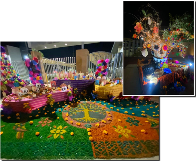 El motivo central es un altar de muertos que incluye un enorme tapete multicolor hecho a base de aserrín, y un lado una cabeza monumental de catrina.