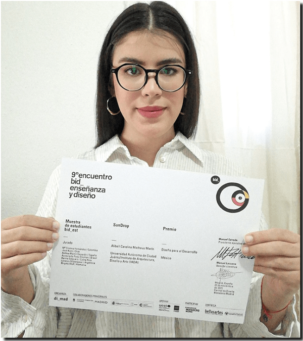 Alibell Carolina Matheus Marín, egresada de la UACJ, recibió el Premio Diseño Para el Desarrollo durante el 9.º Encuentro Bienal Iberoamericano de Diseño, realizado en Madrid, España, del 22 al 24 de noviembre.
