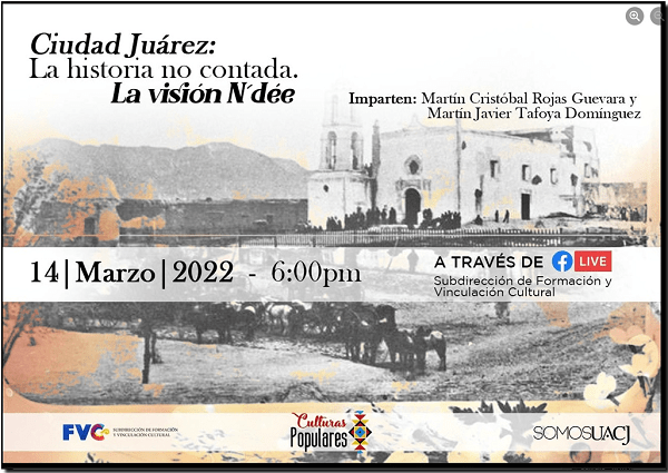 Ciudad Juárez: La historia no contada es el título de este ciclo de conferencias que inicia con La visión N´dée, que será impartida por Martín Cristóbal Rojas Guevara y Martín Javier Tafoya Domínguez el 14 de marzo, a partir de las 18:00 horas, y que será transmitida por Facebook Live de la Subdirección de Formación y Vinculación Cultural de la UACJ.