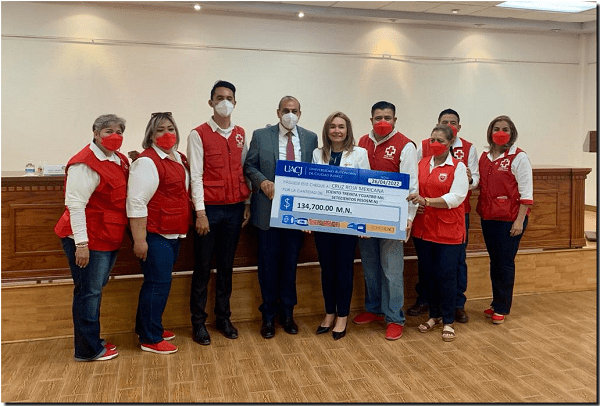 La delegación local de la Cruz Roja Mexicana recibió un cheque por 134 mil 700 pesos, producto de las aportaciones voluntarias que realizaron los estudiantes de la Universidad Autónoma de Ciudad Juárez en el proceso de su inscripción al semestre enero-junio de 2022.