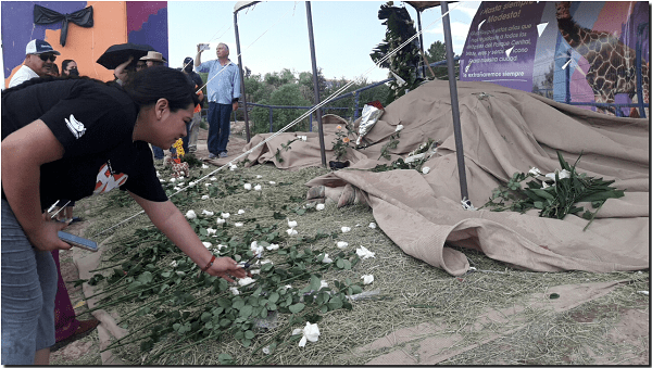 La tarde del jueves -un día después del deceso- fue abierta al público la zona donde yacía el cuerpo sin vida, cubierto enteramente con una gruesa lona, bajo la cual sólo asomaban dos pezuñas. Una carpa protegía del inclemente sol. En buena parte de la reja perimetral, desde la víspera fueron dejados dibujos y cariñosos mensajes de despedida.