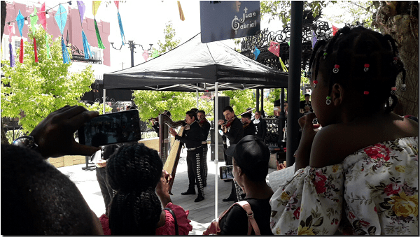 Piezas del repertorio de la música ranchera tradicional (Cielito lindo, etc.), pero también otras más recientes (sin faltar un popurrí de Juan Gabriel) fueron interpretadas en el kiosko de la pequeña plaza, para deleite de propios y extraños (mexicanos y extranjeros). Como era de esperarse, el mariachi puso a bailar a muchos y muchas con el Noa Noa.