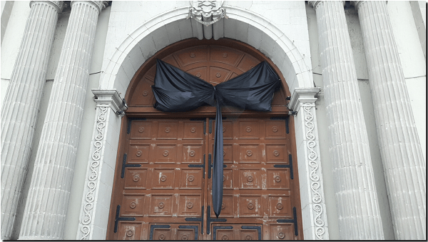 Una vez concluida la liturgia, el arcón con las cenizas que había sido colocado a un lado del altar, con los ornamentos ceremoniales (mitra, cayado, misal, casulla y estola), fue retirado en procesión hacia la salida del templo en cuya puerta ya había sido colocado un gran moño negro.