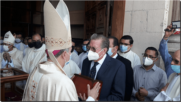 Allí, don José Guadalupe tomó la urna y la entregó a Moisés Ascencio, quien momentos antes había dado un mensaje de agradecimiento a la feligresía católica por el cariño demostrado en todo momento a su hermano. Asimismo dijo que durante su convalecencia en León, don Renato siempre había manifestado su amor por la diócesis fronteriza.