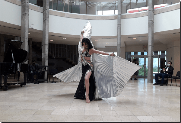 Minutos antes, la Mtra. Dayna Itzel Saldívar y sus alumnas realizaron una soberbia demostración de danzas árabes con hermosos atuendos tradicionales, así como los velos que hicieron flotar por los aires. Éste es otro de los cursos que se imparten en el CUDA.
