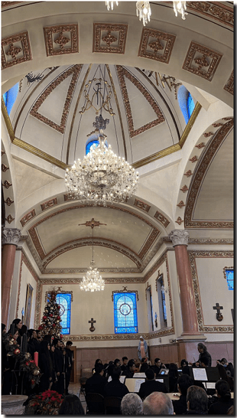 La víspera se había presentado esta misma obra en la Parroquia Santos Mártires Mexicanos, pero el recinto de San Felipe además de proveer una excelente acústica, fue un marco esplendoroso con su nave principal en forma de cruz, sus columnas, sus vitrales y ornamentaciones, su cúpula y sus candiles.